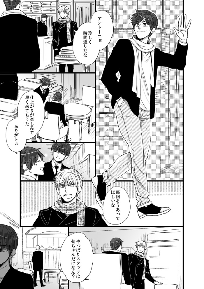 亡くなった祖父の店を継いだアーサーだが、なかなか心を開いてくれない。そんなアーサーを陰ながら支える菊のお話です。