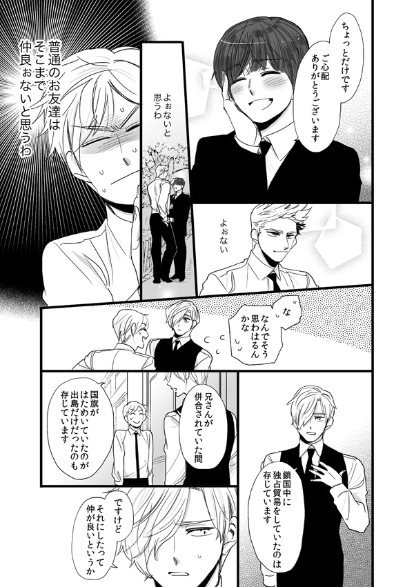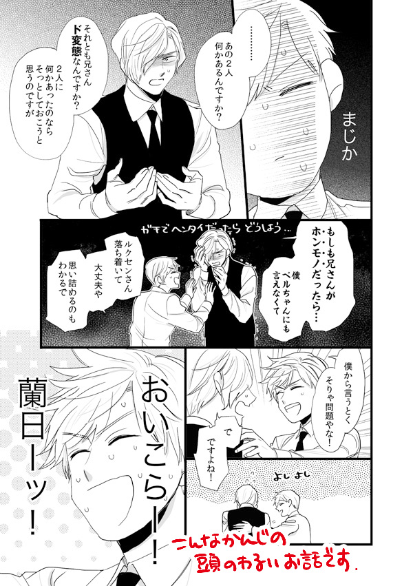 かつて恋人だったことを周囲に一切話していない菊と蘭兄さんですが、その仲のよさを弟ルクセンに怪しまれる話です。