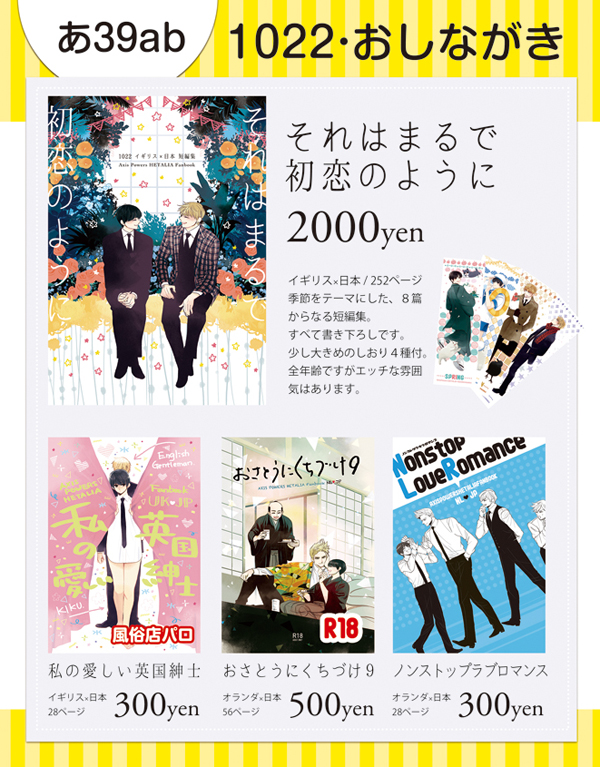 当日のお品書きはこちらになります。先日のエントリにもありましたように、既刊は9日以降受付できるようにします。少々お待ちくださいませ。