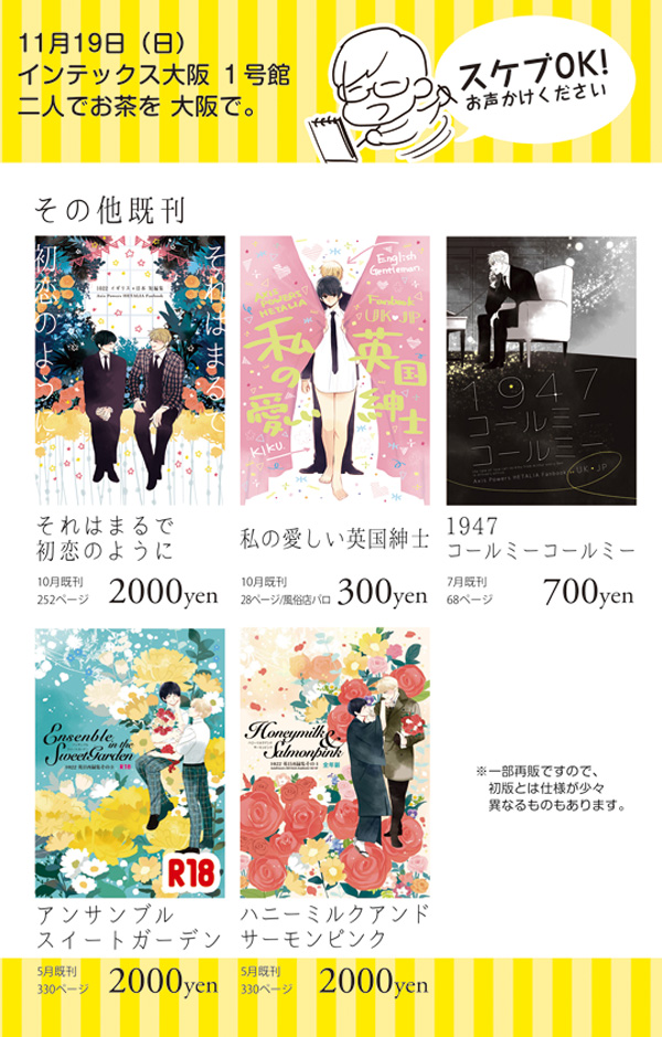11月19日にインテックス大阪で開催される「二人でお茶を 大阪で。」のお品書き+新刊のお知らせです。
