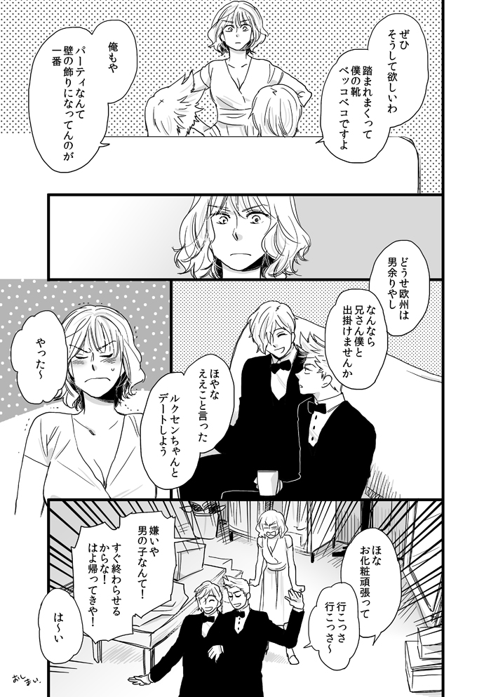 漫画らくがき 兄と妹(3Siblingsおまけ漫画) ベネルクスの「義きょうだい」という関係に、妄想だけが膨らみます 2016-03-09 | Posted in 漫画らくがき | Comments Closed 関連記事 らんにちのボケたおし漫画 らんにち漫画 なんとかトッツォまんが オリンピックらくがき ネシアさん考察 < ドキッ!国だらけのジャージまつり! しまぐにの婚姻届 >