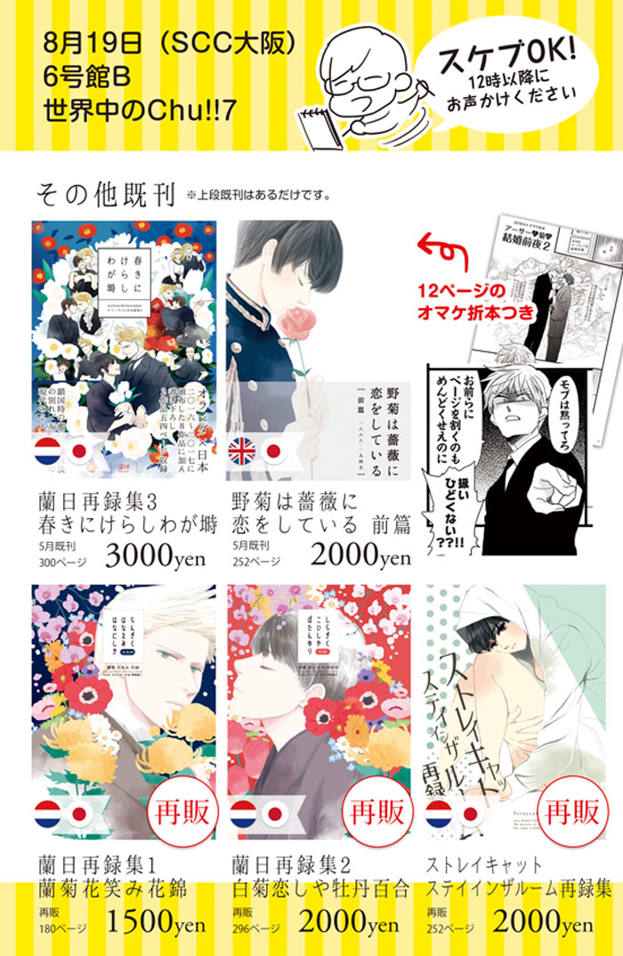 また、蘭日本も出す予定だったのですが、まったく間に合いませんで…。蘭日本に関しては通販だけででも出そうと思っております。お待ちいただけると幸いです。