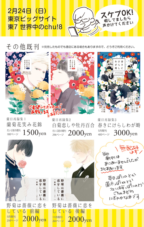 通販作業と印刷ミスがあり、予定が狂って新刊が出せなくなってしまったのですが、とりあえず無配折本は間に合うかと思います…!蘭日っぽいのとか英日っぽいのとかフェリ桜っぽいのとかいろいろにぎやかな本にはなりますが、手にとっていただけると嬉しいです。もちろんこの無配本のみ手にしていただいても大丈夫ですので!