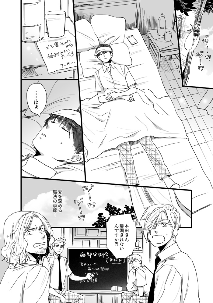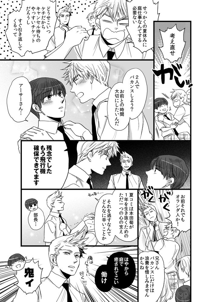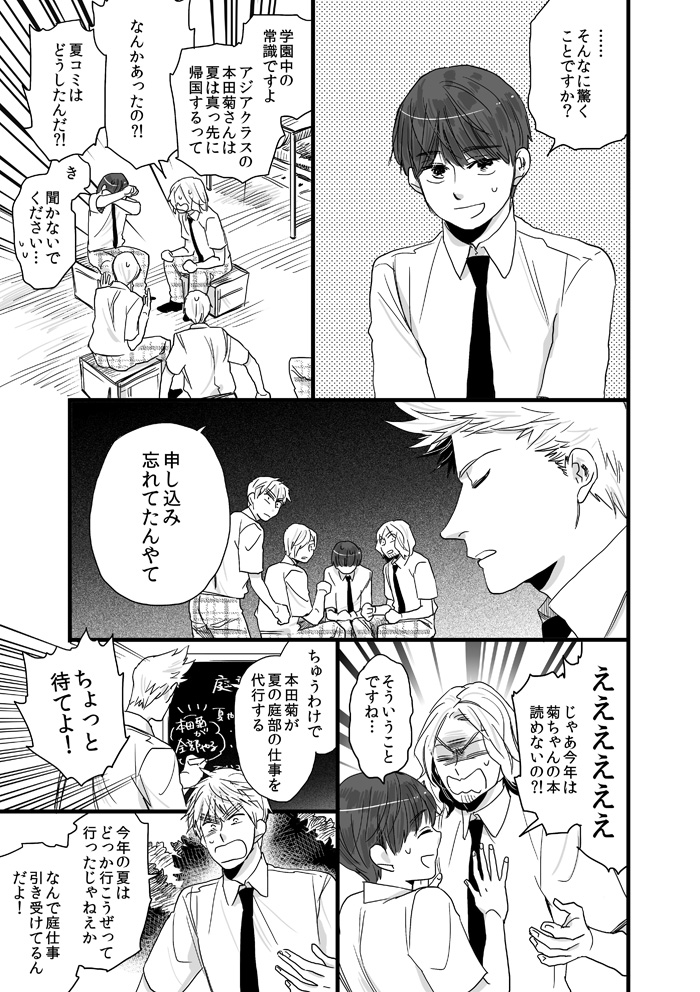 夏休み、菊が部活動に追われ、思った通りのデートができなくなって落ち込むアーサー。