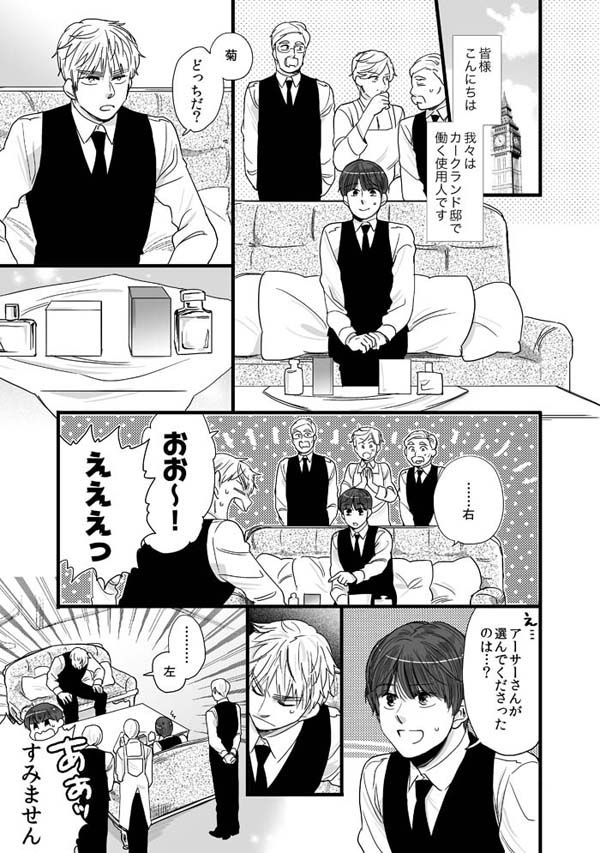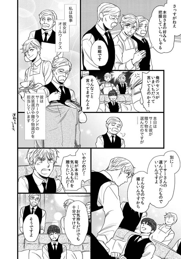 カークランド邸妄想使用人シリーズの3です(※続きものではありません)。シリーズはこれで完結とさせていただきます。今回はヒゲメガネのおじいさんと、本田菊のお話です。