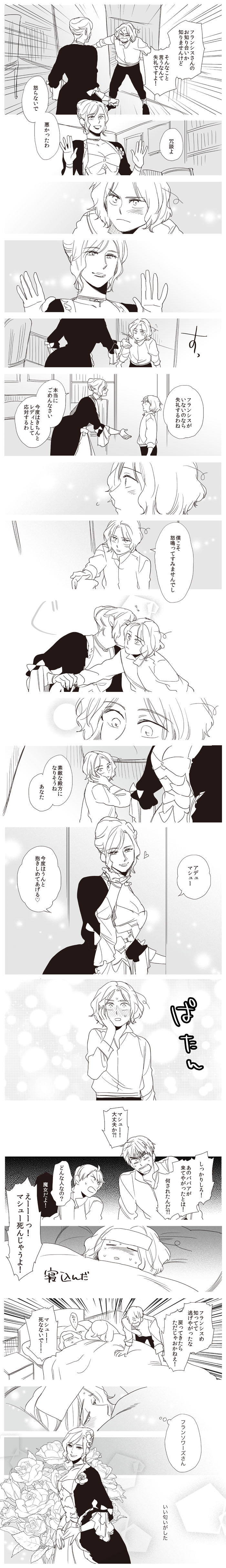 「描いてくれたら原稿頑張る」と言われて、おうまかせろ!!と勢いで描いてみたものの、ロココ調のドレスが描けないもので(どういう仕組みになってるん…?)だましだまし仕上げました…。
